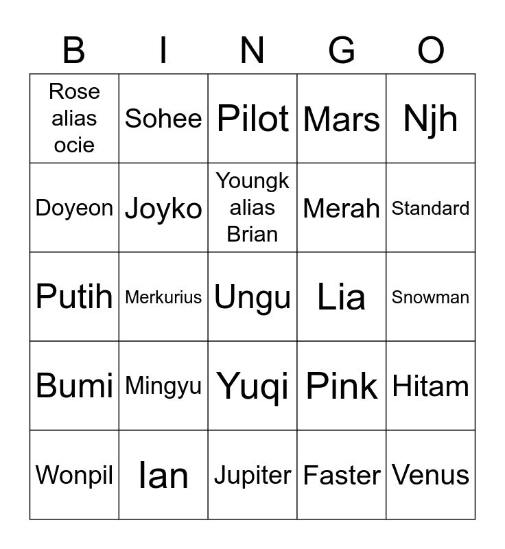 This bingo card has a free space and 24 words: Mingyu, Ian, Youngk alias Brian, Wonpil, Njh, Rose alias ocie, Doyeon, Sohee, Lia, Yuqi, Merah, Putih, Pink, Hitam, Joyko, Faster, Snowman, Pilot, Standard, Merkurius, Venus, Bumi, Mars and Jupiter.