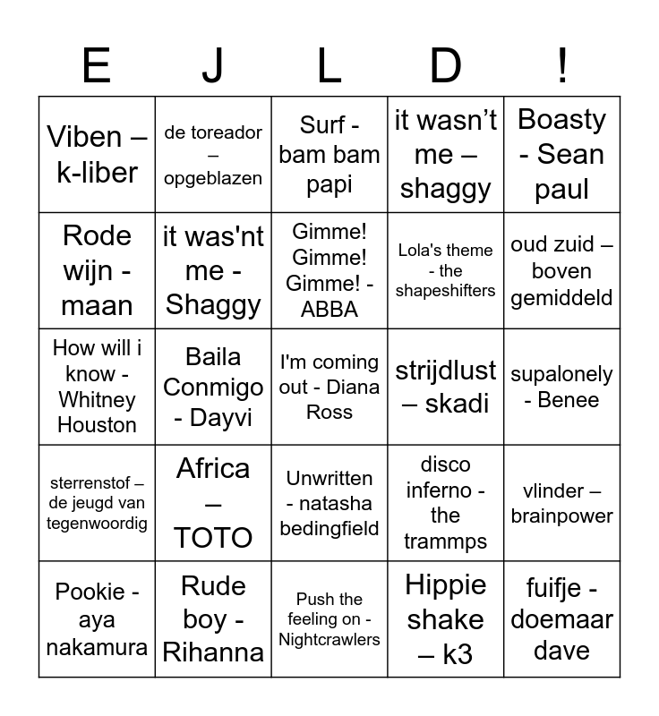 This bingo card has 25 words: Africa – TOTO, Push the feeling on - Nightcrawlers, Gimme! Gimme! Gimme! - ABBA, Pookie - aya nakamura, Boasty - Sean paul, Viben – k-liber, Rode wijn - maan, de toreador – opgeblazen, strijdlust – skadi, Unwritten - natasha bedingfield, Lola's theme - the shapeshifters, How will i know - Whitney Houston, disco inferno - the trammps, vlinder – brainpower, it was'nt me - Shaggy, fuifje - doemaar dave, supalonely - Benee, Surf - bam bam papi, oud zuid – boven gemiddeld, Baila Conmigo - Dayvi, I'm coming out - Diana Ross, Rude boy - Rihanna, sterrenstof – de jeugd van tegenwoordig, it wasn’t me – shaggy and Hippie shake – k3.