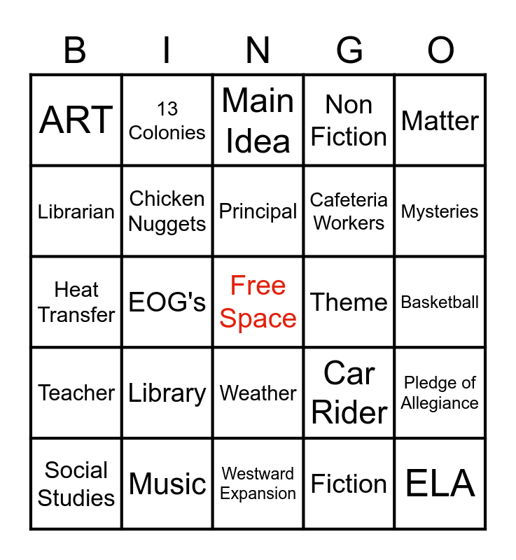 This bingo card has a free space and 45 words: Math, ELA, Science, Social Studies, PE, Fiction, Main Idea, Ecosystems, Matter, Music, Non Fiction, Theme, Weather, Library, Biographies, Westward Expansion, Force and Motion, Heat Transfer, Counseling, Mysteries, 13 Colonies, Human Body Systems, Lunch, ART, Football, Basketball, Recess, Bus Rider, Car Rider, Teacher, Student, Pledge of Allegiance, Lunch Money, Field Trips, Report Card, EOG's, Messy Desk, Hallway Routine, Classroom Job, Principal, Librarian, Cafeteria Workers, Fiestada Pizza, Chicken Nuggets and Beef and Cheese Nachos.