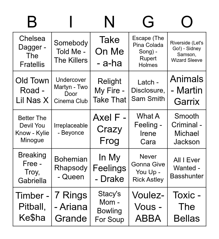 This bingo card has 25 words: Bohemian Rhapsody - Queen, Stacy's Mom - Bowling For Soup, Relight My Fire - Take That, Timber - Pitball, Ke$ha, Riverside (Let's Go!) - Sidney Samson, Wizard Sleeve, Chelsea Dagger - The Fratellis, Old Town Road - Lil Nas X, Somebody Told Me - The Killers, What A Feeling - Irene Cara, In My Feelings - Drake, Latch - Disclosure, Sam Smith, Better The Devil You Know - Kylie Minogue, Never Gonna Give You Up - Rick Astley, All I Ever Wanted - Basshunter, Undercover Martyn - Two Door Cinema Club, Toxic - The Bellas, Smooth Criminal - Michael Jackson, Take On Me - a-ha, Animals - Martin Garrix, Irreplaceable - Beyonce, Axel F - Crazy Frog, 7 Rings - Ariana Grande, Breaking Free - Troy, Gabriella, Escape (The Pina Colada Song) - Rupert Holmes and Voulez-Vous - ABBA.