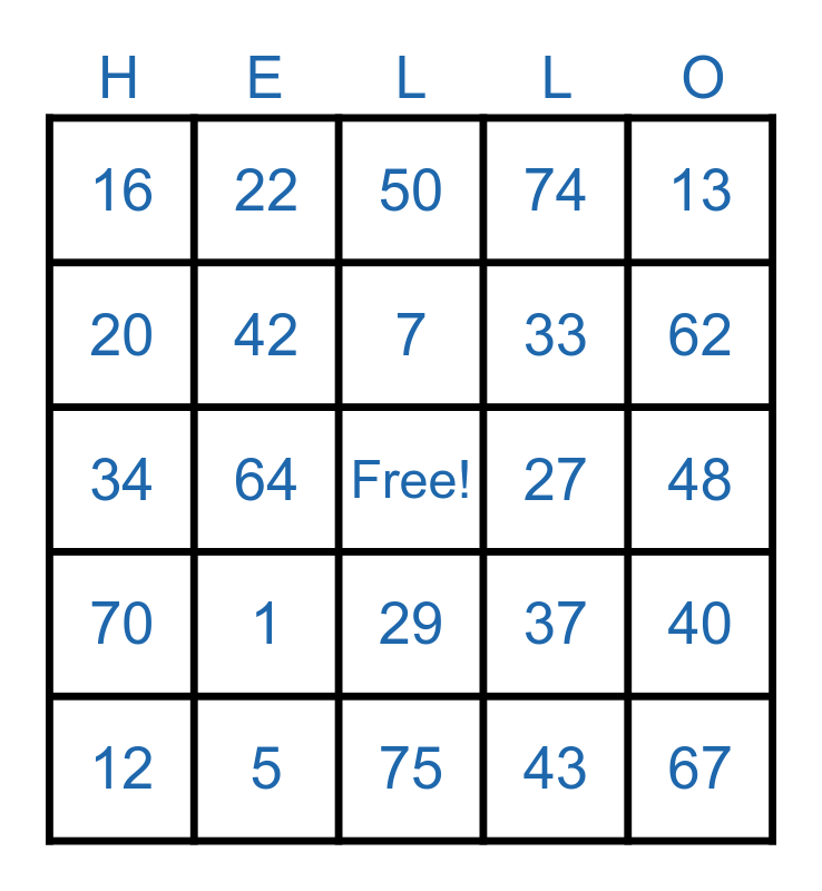 This bingo card has a free space and 24 words: 1, 5, 7, 12, 13, 16, 20, 22, 27, 29, 33, 34, 37, 40, 42, 43, 48, 50, 62, 64, 67, 70, 74 and 75.