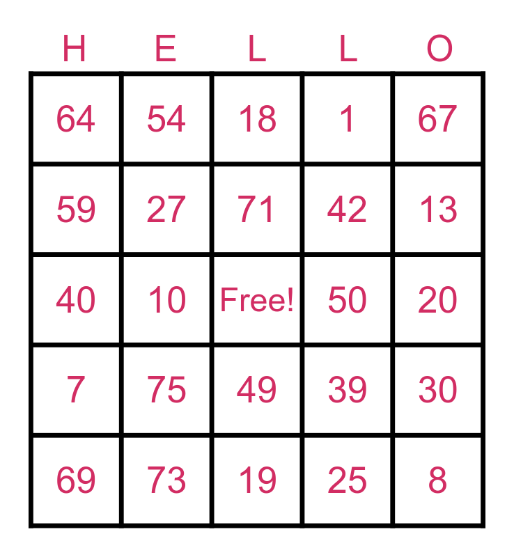 This bingo card has a free space and 24 words: 75, 73, 71, 69, 67, 64, 59, 54, 50, 49, 42, 40, 39, 30, 27, 25, 20, 18, 13, 10, 8, 7, 1 and 19.