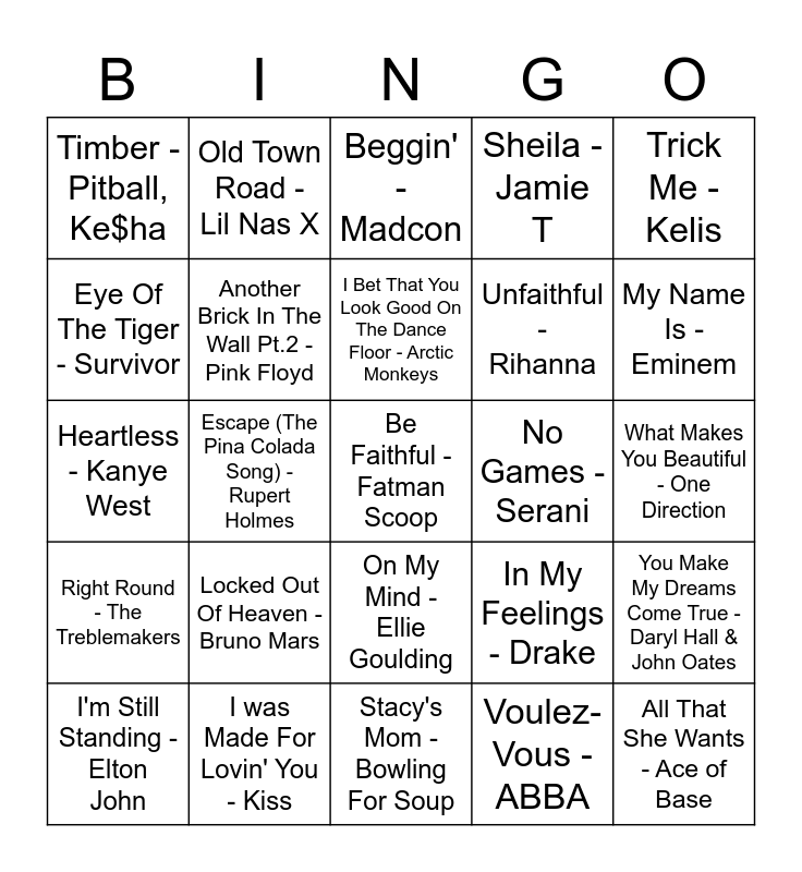 This bingo card has 25 words: Locked Out Of Heaven - Bruno Mars, Stacy's Mom - Bowling For Soup, I Bet That You Look Good On The Dance Floor - Arctic Monkeys, I'm Still Standing - Elton John, Trick Me - Kelis, Timber - Pitball, Ke$ha, Eye Of The Tiger - Survivor, Old Town Road - Lil Nas X, No Games - Serani, On My Mind - Ellie Goulding, Unfaithful - Rihanna, Heartless - Kanye West, In My Feelings - Drake, You Make My Dreams Come True - Daryl Hall & John Oates, Another Brick In The Wall Pt.2 - Pink Floyd, All That She Wants - Ace of Base, What Makes You Beautiful - One Direction, Beggin' - Madcon, My Name Is - Eminem, Escape (The Pina Colada Song) - Rupert Holmes, Be Faithful - Fatman Scoop, I was Made For Lovin' You - Kiss, Right Round - The Treblemakers, Sheila - Jamie T and Voulez-Vous - ABBA.
