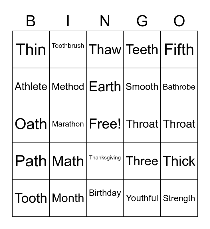 This bingo card has a free space and 24 words: Math, Month, Earth, Tooth, Fifth, Thin, Athlete, Toothbrush, Throat, Thanksgiving, Smooth, Oath, Three, Thick, Method, Youthful, Throat, Thaw, Bathrobe, Marathon, Strength, Path, Teeth and Birthday.