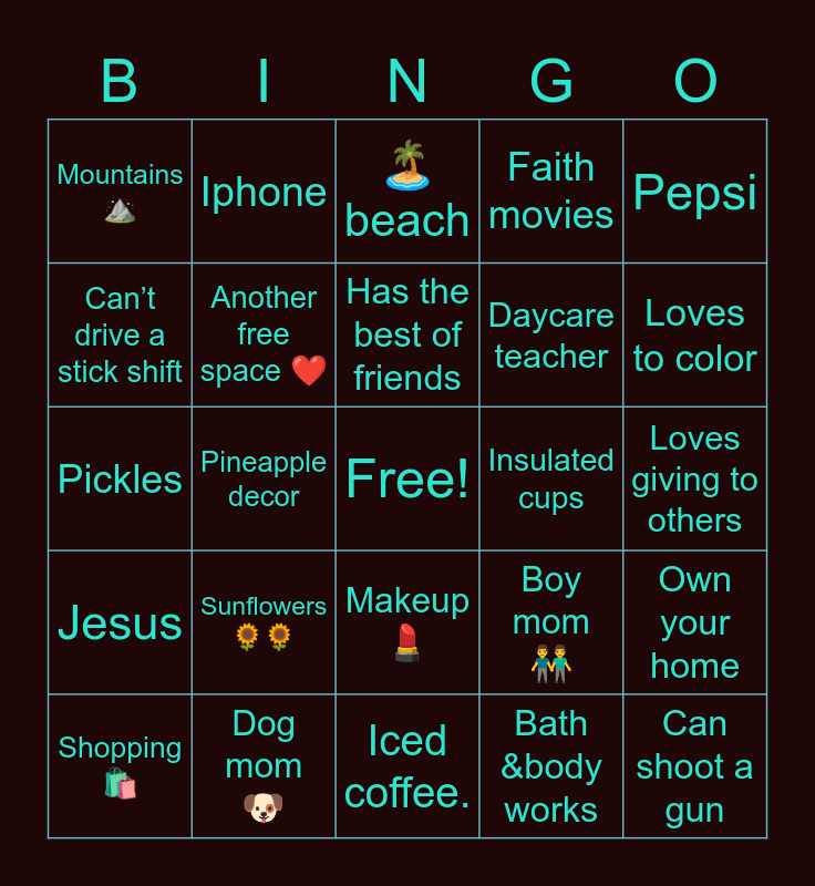 This bingo card has a free space and 24 words: Sunflowers🌻🌻, Dog mom 🐶, Has the best of friends, Shopping 🛍, Pepsi, Mountains ⛰, Can’t drive a stick shift, Iphone, Insulated cups, Makeup 💄, Daycare teacher, Pickles, Boy mom 👬, Own your home, Another free space ❤️, Bath &body works, Loves giving to others, 🏝 beach, Loves to color, Pineapple decor, Can shoot a gun, Jesus, Faith movies and Iced coffee..
