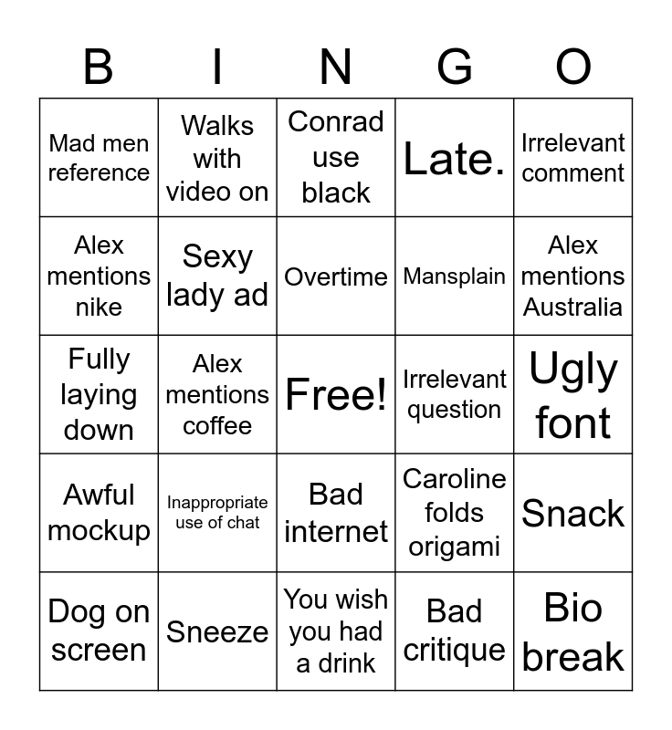 This bingo card has a free space and 24 words: Inappropriate use of chat, Sneeze, Overtime, Dog on screen, Irrelevant comment, Mad men reference, Alex mentions nike, Walks with video on, Irrelevant question, Bad internet, Mansplain, Fully laying down, Caroline folds origami, Snack, Sexy lady ad, Bad critique, Ugly font, Conrad use black, Alex mentions Australia, Alex mentions coffee, Bio break, Awful mockup, Late. and You wish you had a drink.