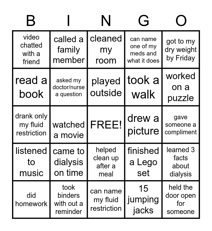 This bingo card has a free space and 24 words: came to dialysis on time, took binders with out a reminder, played outside, did homework, got to my dry weight by Friday, video chatted with a friend, read a book, called a family member, drew a picture, helped clean up after a meal, took a walk, drank only my fluid restriction, finished a Lego set, learned 3 facts about dialysis, asked my doctor/nurse a question, 15 jumping jacks, gave someone a compliment, cleaned my room, worked on a puzzle, watched a movie, held the door open for someone, listened to music, can name one of my meds and what it does and can name my fluid restriction.