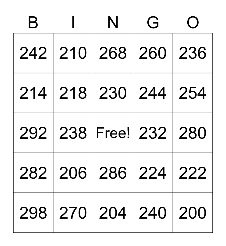 This bingo card has a free space and 52 words: 200, 200, 202, 204, 206, 208, 210, 212, 214, 216, 218, 220, 222, 224, 226, 228, 230, 232, 234, 236, 238, 240, 242, 244, 246, 248, 250, 252, 254, 256, 258, 260, 262, 264, 266, 268, 270, 272, 274, 276, 278, 280, 282, 284, 286, 288, 290, 292, 294, 296, 298 and 300.