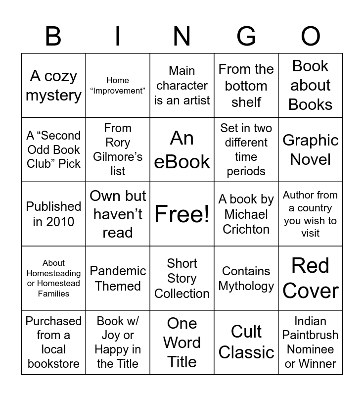 This bingo card has a free space and 24 words: Pandemic Themed, Book w/ Joy or Happy in the Title, An eBook, Purchased from a local bookstore, Book about Books, A cozy mystery, A “Second Odd Book Club” Pick, Home “Improvement”, A book by Michael Crichton, Short Story Collection, Set in two different time periods, Published in 2010, Contains Mythology, Red Cover, From Rory Gilmore’s list, Cult Classic, Author from a country you wish to visit, Main character is an artist, Graphic Novel, Own but haven’t read, Indian Paintbrush Nominee or Winner, About Homesteading or Homestead Families, From the bottom shelf and One Word Title.