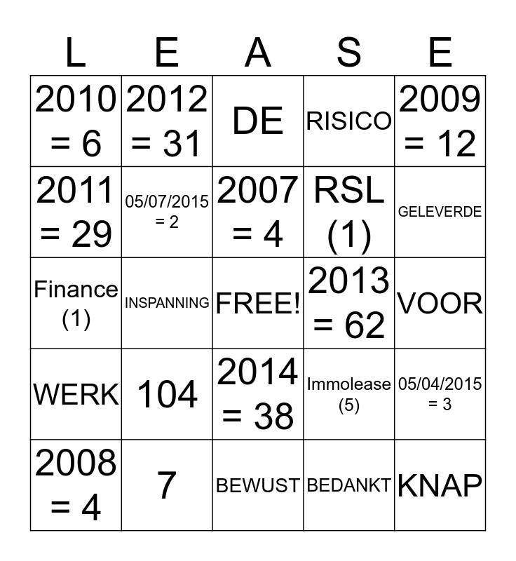 This bingo card has a free space and 24 words: 104, 7, 2007 = 4, 2008 = 4, 2009 = 12, 2010 = 6, 2011 = 29, 2012 = 31, 2013 = 62, 2014 = 38, RSL (1), Finance (1), Immolease (5), 05/04/2015 = 3, 05/07/2015 = 2, BEDANKT, VOOR, DE, GELEVERDE, INSPANNING, KNAP, WERK, RISICO and BEWUST.