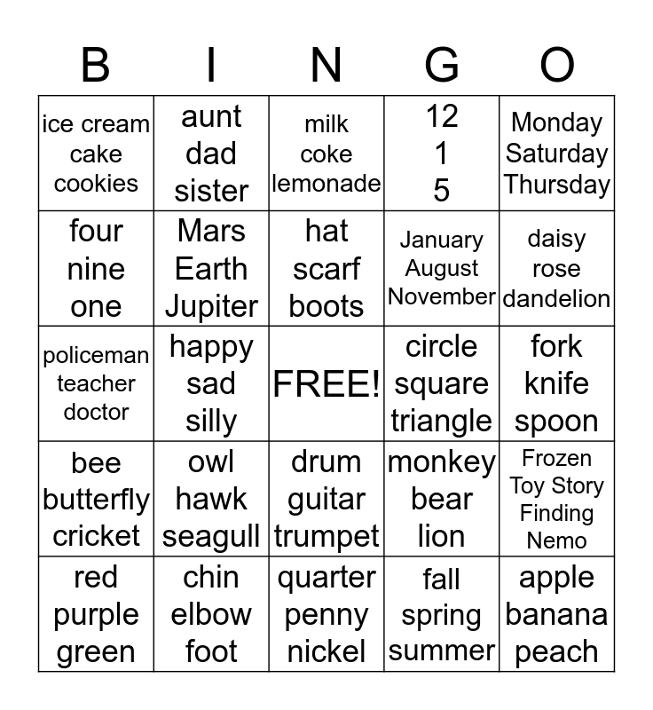 This bingo card has a free space and 24 words: owl hawk seagull, chin elbow foot, hat scarf boots, red purple green, Monday Saturday Thursday, ice cream cake cookies, four nine one, aunt dad sister, circle square triangle, drum guitar trumpet, January August November, policeman teacher doctor, monkey bear lion, Frozen Toy Story Finding Nemo, Mars Earth Jupiter, fall spring summer, fork knife spoon, milk coke lemonade, daisy rose dandelion, happy sad silly, apple banana peach, bee butterfly cricket, 12 1 5 and quarter penny nickel.