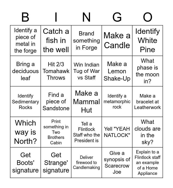 This bingo card has 25 words: Print something in Two Brothers Cabin, Deliver firewood to Candlemaking, Win Indian Tug of War vs Staff, Get Boots' signature, Identify White Pine, Identify a piece of metal in the forge, Bring a deciduous leaf, Catch a fish in the well, Identify a metamorphic rock, Tell a Flintlock Staff who the President is, Make a Lemon Shake-Up, Identify Sedimentary Rocks, Yell "YEAH NATLOCK", What clouds are in the sky?, Hit 2/3 Tomahawk Throws, Explain to a Flintlock staff an example of a Home Appliance, Make a bracelet at Leatherwork, Brand something in Forge, What phase is the moon in?, Find a piece of Sandstone, Make a Mammal Hut, Get Strange' signature, Which way is North?, Make a Candle and Give a synopsis of Scarecrow Joe.