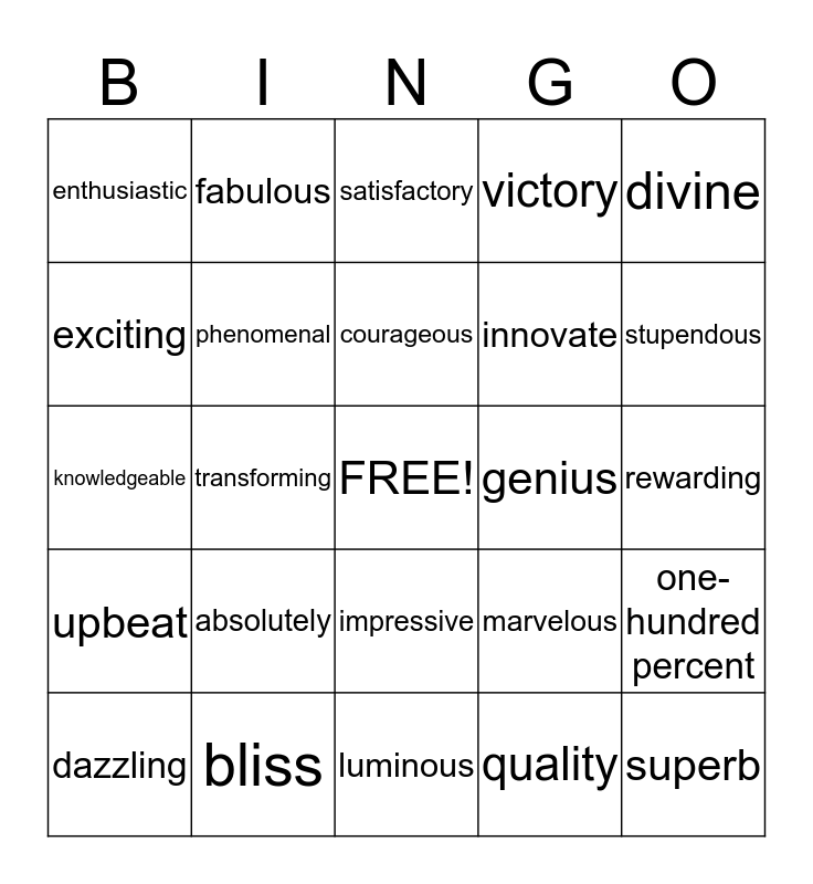 This bingo card has a free space and 24 words: absolutely, bliss, courageous, dazzling, divine, enthusiastic, exciting, fabulous, genius, impressive, innovate, knowledgeable, marvelous, one-hundred percent, phenomenal, quality, rewarding, satisfactory, stupendous, transforming, superb, upbeat, victory and luminous.