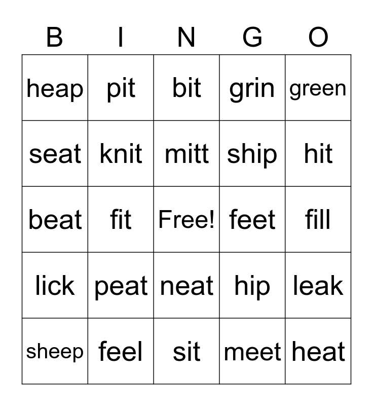 This bingo card has a free space and 24 words: peat, feel, mitt, sheep, green, heap, seat, pit, feet, neat, ship, beat, hip, leak, knit, meet, fill, bit, hit, fit, heat, lick, grin and sit.