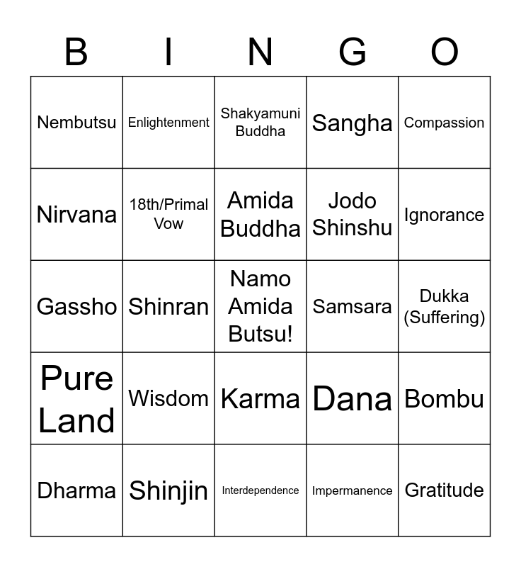 This bingo card has a free space and 24 words: Wisdom, Shinjin, Amida Buddha, Dharma, Compassion, Nembutsu, Nirvana, Enlightenment, Samsara, Karma, Jodo Shinshu, Gassho, Dana, Bombu, 18th/Primal Vow, Impermanence, Dukka (Suffering), Shakyamuni Buddha, Ignorance, Shinran, Gratitude, Pure Land, Sangha and Interdependence.