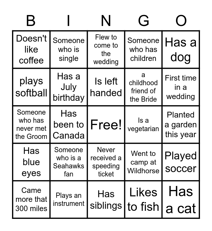 This bingo card has a free space and 24 words: Someone who is a Seahawks fan, Plays an instrument, Is left handed, Came more that 300 miles, Has a dog, Doesn't like coffee, plays softball, Someone who is single, Is a vegetarian, Never received a speeding ticket, a childhood friend of the Bride, Someone who has never met the Groom, Went to camp at Wildhorse, Played soccer, Has a July birthday, Likes to fish, Planted a garden this year, Flew to come to the wedding, First time in a wedding, Has been to Canada, Has a cat, Has blue eyes, Someone who has children and Has siblings.