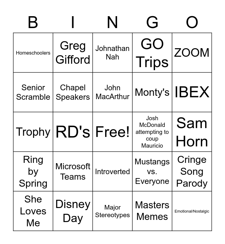 This bingo card has a free space and 24 words: Microsoft Teams, Disney Day, John MacArthur, She Loves Me, ZOOM, Homeschoolers, Senior Scramble, Greg Gifford, Josh McDonald attempting to coup Mauricio, Introverted, Monty's, Trophy, Mustangs vs. Everyone, Cringe Song Parody, Chapel Speakers, Masters Memes, Sam Horn, Johnathan Nah, IBEX, RD's, Emotional/Nostalgic, Ring by Spring, GO Trips and Major Stereotypes.