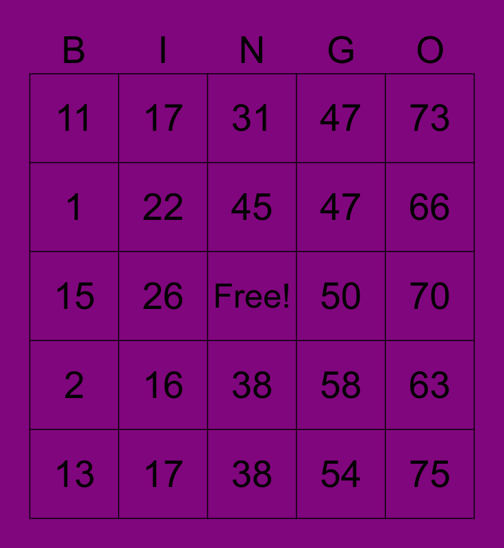 This bingo card has a free space and 29 words: 7, 17, 31, 46, 73, 11, 22, 45, 50, 63, 13, 26, 54, 75, 15, 30, 38, 58, 66, 2, 16, 33, 47, 70, 1, 17, 38, 47 and 66.