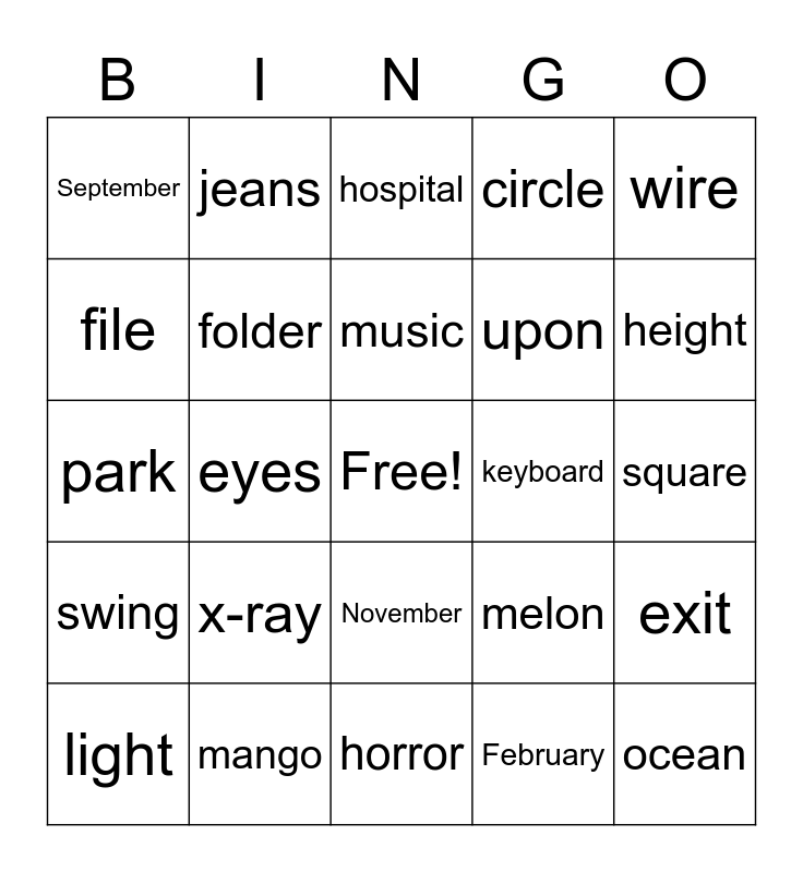 This bingo card has a free space and 183 words: cup, glass, paper, value, height, house, road, car, sentence, true, shoes, table, upon, due, file, phone, bottle, shelf, wall, clock, box, mirror, building, names, light, roof, shop, bag, wire, money, coins, window, door, planet, camera, rose, vase, milk, egg, kitchen, ball, plant, eraser, ruler, juice, folder, toothpick, brush, tooth paste, ears, eyes, nose, mouth, hair, head, legs, mouse, keyboard, printer, scanner, x-ray, lotion, shampoo, soap, red, brown, orange, apple, blue, strawberry, grapes, cucumber, potato, green, black, white, banana, peach, sea, pool, mango, blueberry, cake, chocolate, grapes, pineapple, watermelon, melon, onion, garlic, arm, picture, frame, coffee, park, cat, dog, butterfly, age, cartoon, comedy, horror, animation, exit, sofa, dinner, lunch, fork, spoon, knife, plate, January, February, march, April, May, June, July, August, September, October, November, December, Year, Month, tissue, calendar, open, close, bell, dance, music, song, ocean, dress, jeans, skirt, shirt, dream, clouds, sky, sun, moon, rain, wind, doctor, hospital, ice-cream, snow, rings, food, map, kid, children, mother, father, brother, sister, son, daughter, husband, wife, candy, sunglasses, store, work, job, circle, square, graduate, school, university, bracelet, pray, rice, letter, carrot, bunny, slide, swing, birds, clown and balloon.