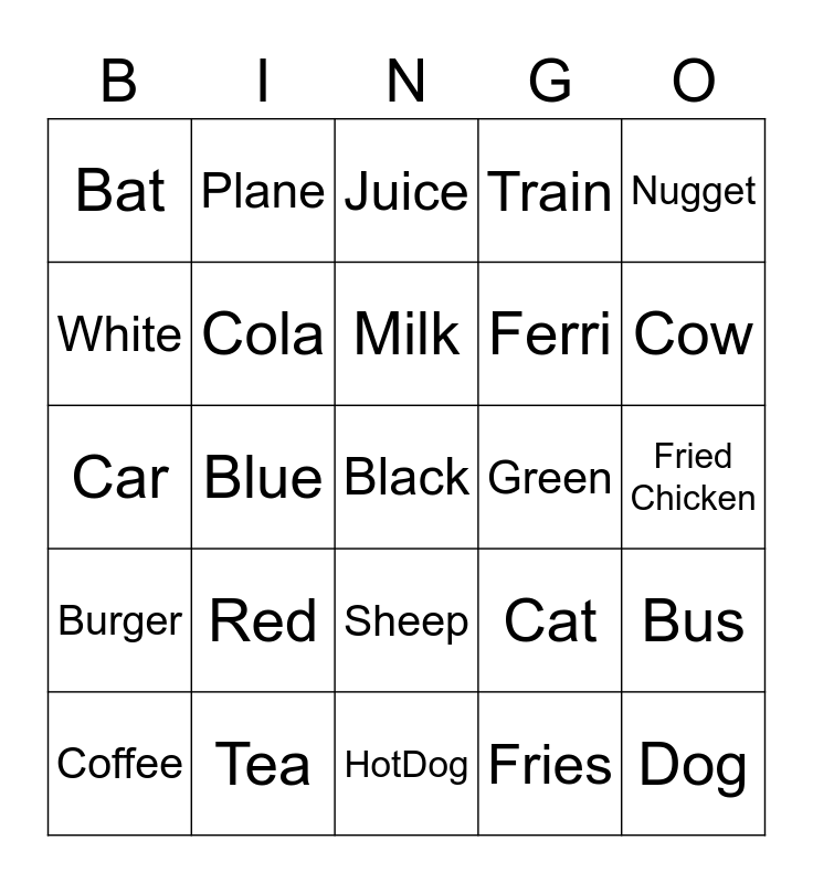 This bingo card has a free space and 24 words: Red, Tea, Milk, Coffee, Nugget, Bat, White, Plane, Green, Sheep, Ferri, Car, Cat, Bus, Cola, Fries, Fried Chicken, Juice, Cow, Blue, Dog, Burger, Train and HotDog.