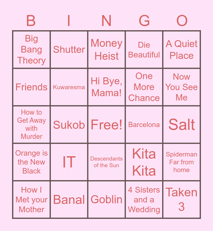 This bingo card has a free space and 49 words: 13 Reasons Why, Purge, Crash Landing on You, 4 Sisters and a Wedding, Salt, Riverdale, Shutter, Hyena, One More Chance, I am Legend, Friends, Sukob, Kita Kita, Taken 3, Lucifer, Eerie, Money Heist, Barcelona, The Martian, Big Bang Theory, Banal, Goblin, Die Beautiful, A Quiet Place, Modern Family, IT, Hi Bye, Mama!, Camp Sawi, Spiderman Far from home, Orange is the New Black, In the Tall Grass, Descendants of the Sun, Crazy Beautiful You, John Wick, How I Met your Mother, The Conjuring, El Chapo, My Ex and Whys, Now You See Me, The Good Place, The Number 23, Legend of the Blue Sea, That Thing Called Tadhana, The Devil Wears Prada, How to Get Away with Murder, Kuwaresma, Kingdom, Sid & Aya and Bird Box.