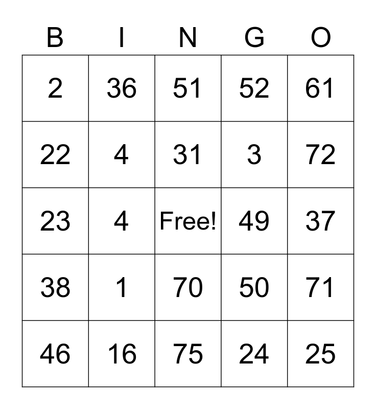 This bingo card has a free space and 24 words: 1, 16, 31, 46, 61, 2, 22, 36, 49, 70, 3, 23, 50, 71, 4, 24, 37, 51, 72, 4, 25, 38, 52 and 75.