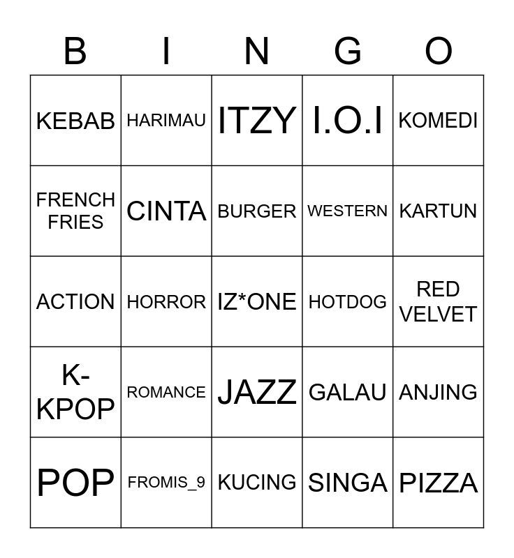 This bingo card has a free space and 24 words: POP, ROMANCE, BURGER, SINGA, KOMEDI, KEBAB, HARIMAU, ITZY, HOTDOG, RED VELVET, ACTION, CINTA, GALAU, ANJING, FRENCH FRIES, FROMIS_9, KUCING, I.O.I, KARTUN, K-KPOP, HORROR, JAZZ, WESTERN and PIZZA.