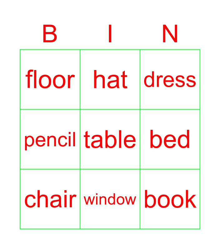 This bingo card has a free space and 8 words: bed, dress, hat, chair, floor, book, pencil and window.