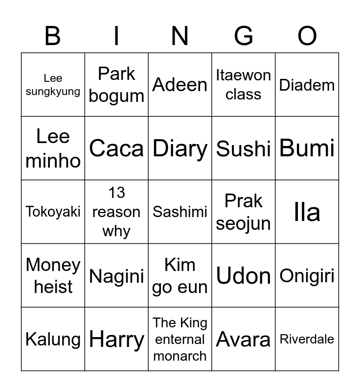 This bingo card has a free space and 24 words: Nagini, Harry, Diary, Kalung, Diadem, Lee sungkyung, Lee minho, Park bogum, Prak seojun, Kim go eun, Sushi, Tokoyaki, Udon, Onigiri, Caca, Avara, Ila, Adeen, Bumi, 13 reason why, Riverdale, Money heist, Itaewon class and The King enternal monarch.