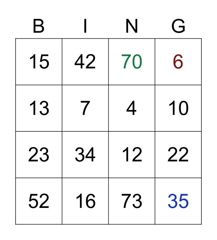 This bingo card has 35 words: 1, 2, 3, 4, 5, 6, 7, 8, 10, 11, 12, 13, 9, 14, 15, 16, 31, 22, 35, 52, 90, 88, 69, 25, 70, 34, 44, 49, 23, 73, 50, 51, 52, 42 and 75.