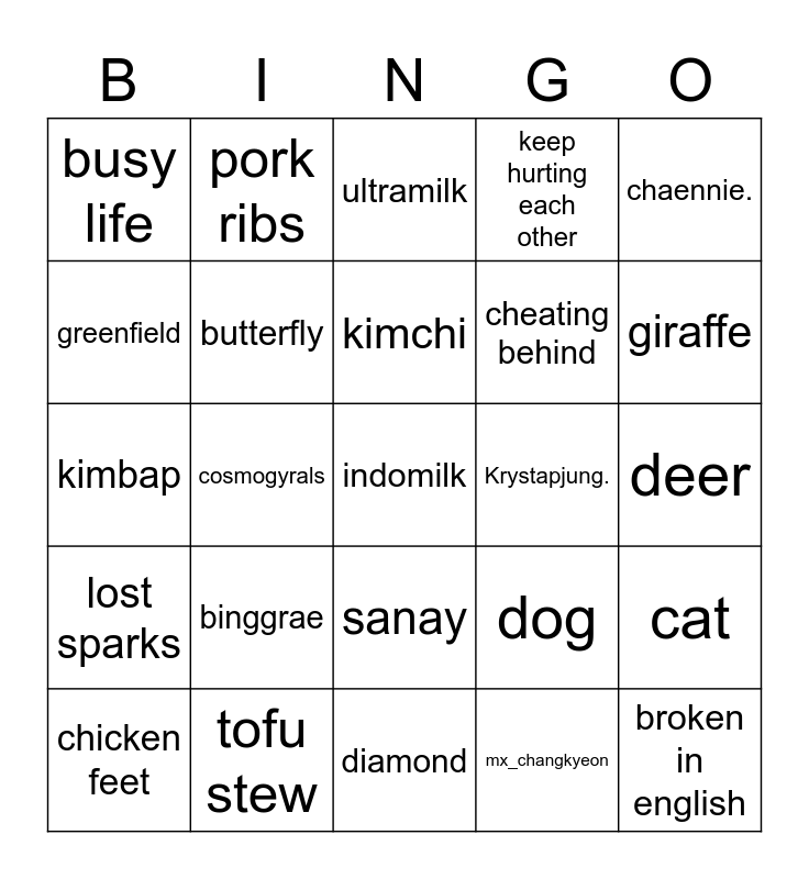 This bingo card has a free space and 24 words: binggrae, tofu stew, kimchi, chicken feet, chaennie., busy life, greenfield, pork ribs, Krystapjung., sanay, cheating behind, kimbap, dog, cat, butterfly, mx_changkyeon, deer, ultramilk, giraffe, cosmogyrals, broken in english, lost sparks, keep hurting each other and diamond.