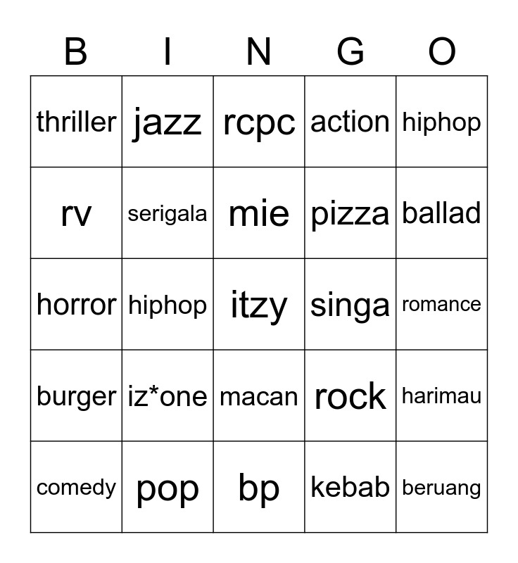 This bingo card has a free space and 24 words: iz*one, pop, mie, comedy, hiphop, thriller, rv, jazz, singa, macan, pizza, horror, rock, harimau, serigala, kebab, romance, rcpc, ballad, hiphop, beruang, burger, action and bp.