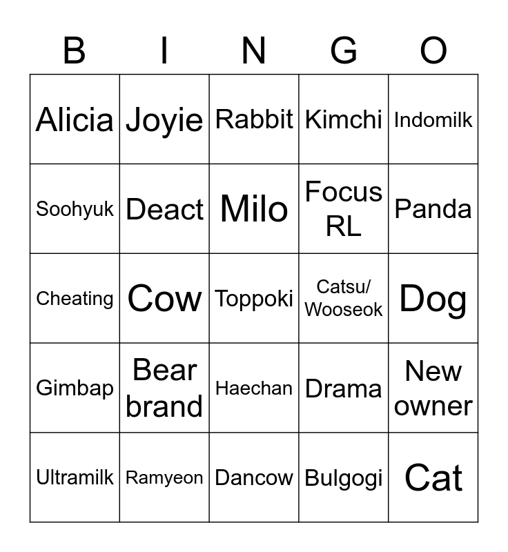 This bingo card has 25 words: Bear brand, Dancow, Milo, Ultramilk, Indomilk, Alicia, Soohyuk, Joyie, Catsu/ Wooseok, Haechan, Focus RL, Cheating, Drama, New owner, Deact, Cat, Dog, Rabbit, Panda, Cow, Toppoki, Ramyeon, Gimbap, Kimchi and Bulgogi.
