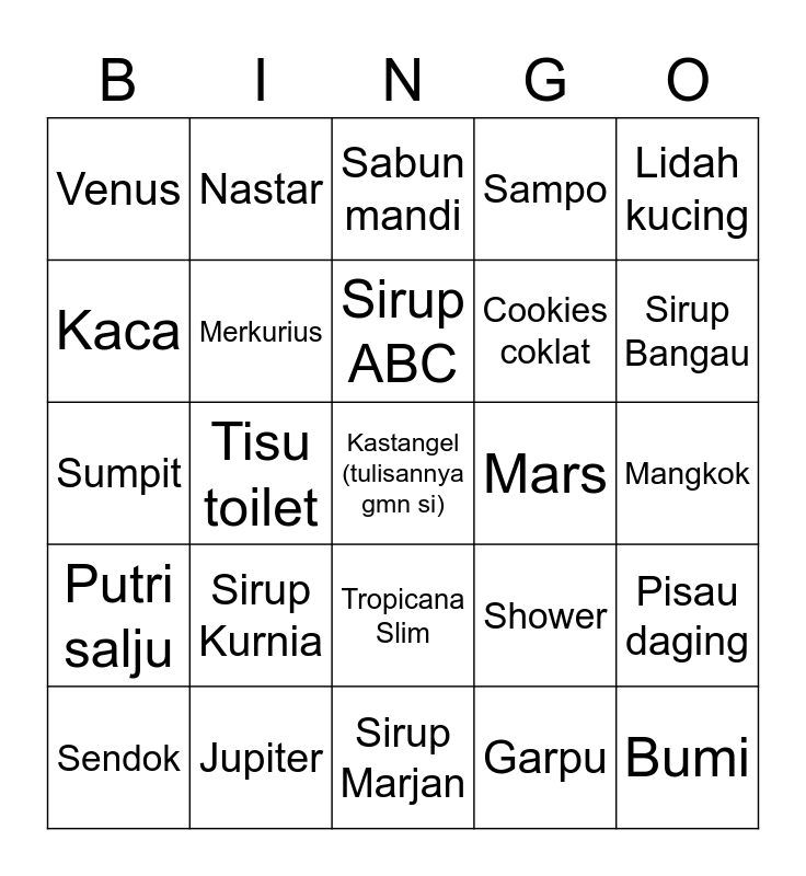 This bingo card has 25 words: Sirup Kurnia, Sirup Marjan, Sirup ABC, Sendok, Lidah kucing, Venus, Kaca, Nastar, Mars, Tropicana Slim, Cookies coklat, Sumpit, Shower, Pisau daging, Merkurius, Bumi, Mangkok, Sabun mandi, Sirup Bangau, Tisu toilet, Kastangel (tulisannya gmn si), Jupiter, Putri salju, Sampo and Garpu.