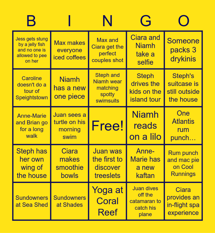 This bingo card has 56 words: Ciara wants coconut prawns, Ciara makes smoothie bowls, Ciara doesn't do 10 roly polys, Ciara and Niamh take a selfie, Ciara provides an in-flight spa experience, Niamh preempts coronavirus and wipes down the whole plane, Niamh has a new one piece, Ciara, Niamh and Jess hang out with Rihanna on the beach, Niamh reads on a lilo, Jess asks someone to play bat bat oops, Jess gets stung by a jelly fish and no one is allowed to pee on her, Jess loses her passport…obvs, Free!, Jess has a new bikini, Max learns a new family joke, Max gets the beers in, Max makes everyone iced coffees, Max and Ciara get the perfect couples shot, Max preempts coronavirus and practices social distancing in the sea, Steph's suitcase is still outside the house, Steph has her own wing of the house, Steph is the paddle boarding pro, Steph and Niamh wear matching spotty swimsuits, Steph drives the kids on the island tour, Steph has a new pair of sunglasses, Anne-Marie and Brian go for a long walk, Brian goes to Massis, girls go to yoga, Brian loses his glasses paddle boarding, Anne-Marie has a new kaftan, Brian and Juan wait an hour at the fish fry, Anne-Marie takes a photo of the glass bottom boat, Anne-Marie and Caroline laugh at their own jokes, Caroline makes a plan, Caroline tells us something about Caribbean flowers, One Atlantis rum punch…, Caroline doesn't do a tour of Speightstown, Juan sees a turtle on his morning swim, Juan was the first to discover treeslets, Juan dives off the catamaran to catch his plane, Someone packs 3 drykinis, Marlene makes 9 rum punches, Gilly gally night!, Yoga at Coral Reef, Touched the Sandy Lane raft, Sundowners at Daphne's, Sundowners at Sea Shed, Sundowners at Shades, Sundowners at Little Bristol Bar, Sundowners at John Moore's Bar, Sundowners at St Albans, Sundowners at Payne's Pay, Fish cakes at Fisherman's Pub, Breakfast at Café Carizma, Time to serenade Sweet Caroline, Rum punch and mac pie on Cool Runnings and Fish cutters at The Roundhouse.