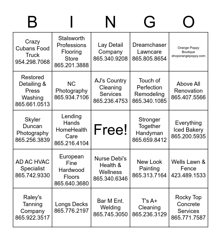 This bingo card has a free space and 24 words: European Fine Hardwood Floors 865.640.3680, Longs Decks 865.776.2197, AJ's Country Cleaning Services 865.236.4753, Raley's Tanning Company 865.922.3517, Orange Poppy Boutique shoporangepoppy.com, Crazy Cubans Food Truck 954.298.7068, Restored Detailing & Press Washing 865.661.0513, Stalsworth Professions Flooring Store 865.201.3888, Stronger Together Handyman 865.659.8412, Nurse Debi's Health & Wellness 865.340.6346, Touch of Perfection Remodeling 865.340.1085, Skyler Duncan Photography 865.256.3839, New Look Painting 865.313.7164, Wells Lawn & Fence 423.489.1533, NC Photography 865.934.7106, T's A+ Cleaning 865.236.3129, Everything Iced Bakery 865.200.5935, Lay Detail Company 865.340.9208, Above All Renovation 865.407.5566, Lending Hands HomeHealth Care 865.216.4104, Rocky Top Concrete Services 865.771.7587, AD AC HVAC Specialist 865.742.9330, Dreamchaser Lawncare 865.805.8654 and Bar M Ent. Welding 865.745.3050.