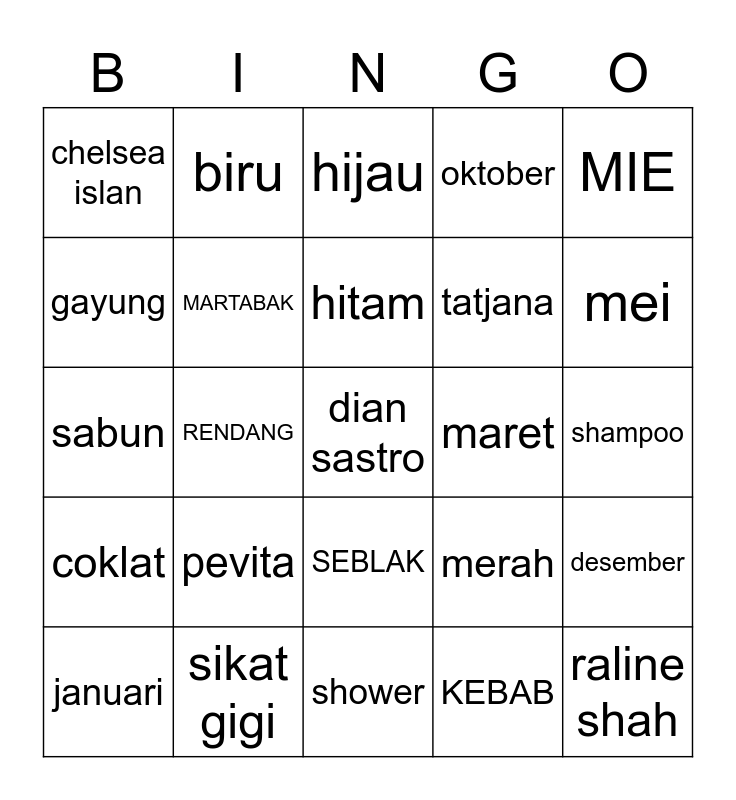 This bingo card has 25 words: pevita, shower, hitam, januari, MIE, chelsea islan, gayung, biru, maret, SEBLAK, tatjana, sabun, merah, desember, MARTABAK, raline shah, shampoo, hijau, mei, RENDANG, dian sastro, sikat gigi, coklat, oktober and KEBAB.