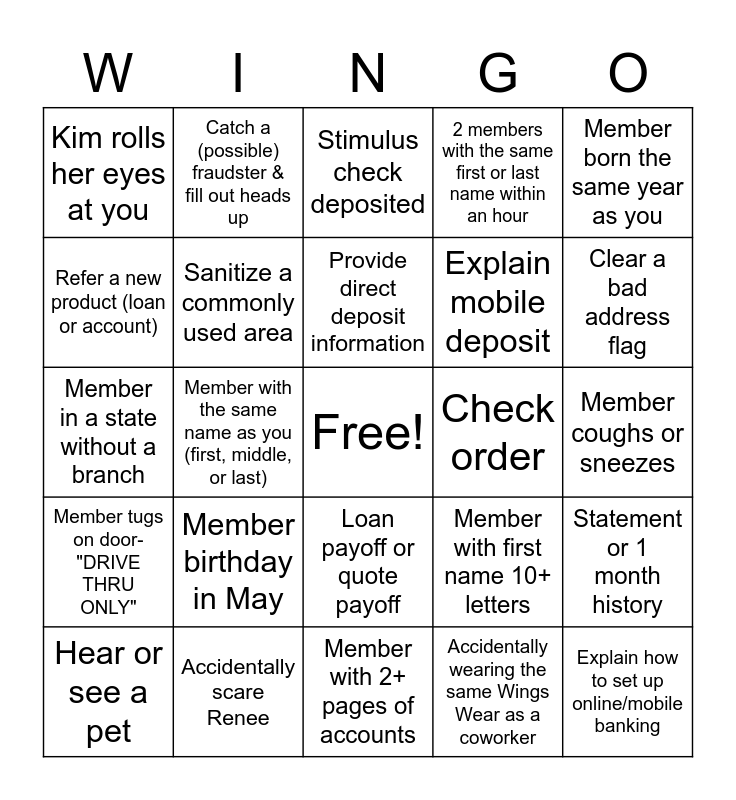 This bingo card has a free space and 24 words: Member birthday in May, Accidentally scare Renee, Provide direct deposit information, Hear or see a pet, Member born the same year as you, Kim rolls her eyes at you, Refer a new product (loan or account), Catch a (possible) fraudster & fill out heads up, Check order, Loan payoff or quote payoff, Explain mobile deposit, Member in a state without a branch, Member with first name 10+ letters, Statement or 1 month history, Sanitize a commonly used area, Accidentally wearing the same Wings Wear as a coworker, Member coughs or sneezes, Stimulus check deposited, Clear a bad address flag, Member with the same name as you (first, middle, or last), Explain how to set up online/mobile banking, Member tugs on door- "DRIVE THRU ONLY", 2 members with the same first or last name within an hour and Member with 2+ pages of accounts.