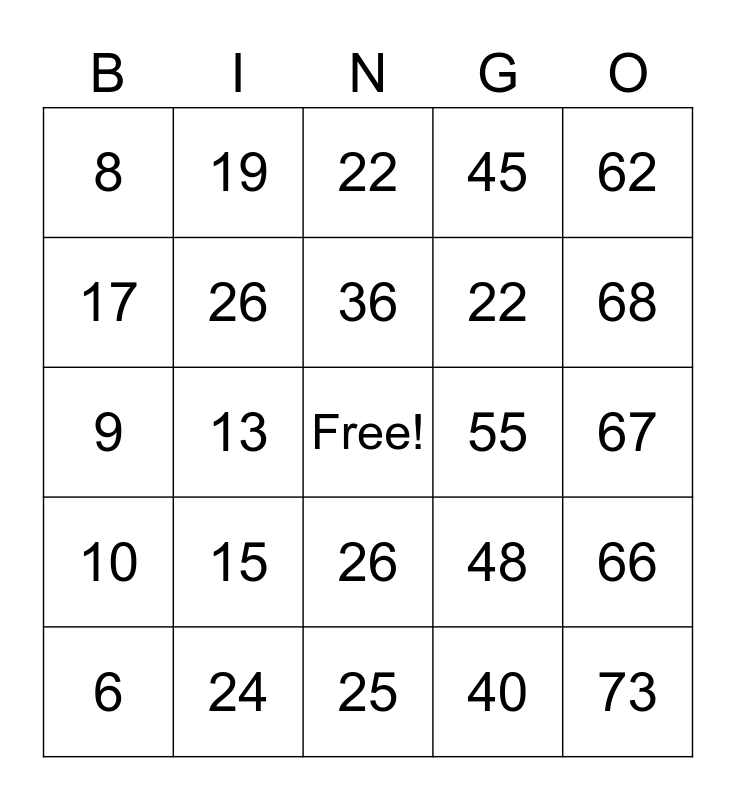 This bingo card has a free space and 96 words: 1, 10, 20, 40, 60, 2, 11, 21, 41, 61, 3, 12, 42, 62, 4, 13, 22, 43, 63, 5, 14, 23, 44, 64, 6, 15, 24, 45, 65, 7, 16, 25, 46, 66, 8, 17, 26, 47, 67, 9, 18, 27, 48, 68, 10, 19, 28, 49, 69, 11, 20, 29, 50, 70, 12, 21, 30, 51, 71, 13, 22, 31, 52, 72, 14, 23, 32, 53, 73, 15, 24, 33, 54, 74, 16, 25, 34, 55, 75, 17, 26, 35, 56, 76, 22, 36, 57, 77, 37, 58, 22, 38, 59, 39, 22 and 22.