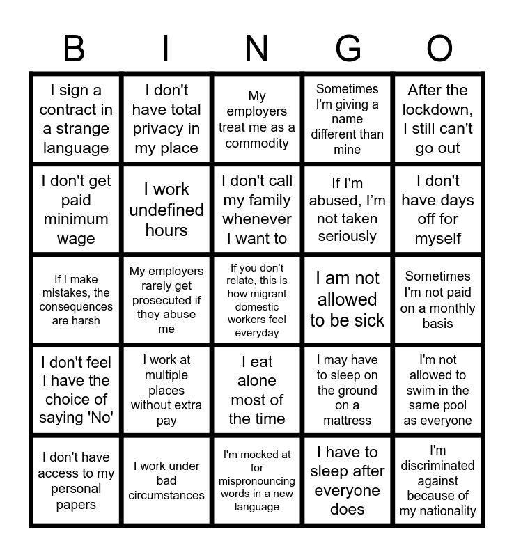 This bingo card has a free space and 24 words: I work at multiple places without extra pay, I work under bad circumstances, I don't call my family whenever I want to, I don't have access to my personal papers, After the lockdown, I still can't go out, I sign a contract in a strange language, I don't get paid minimum wage, I don't have total privacy in my place, I am not allowed to be sick, I eat alone most of the time, If I'm abused, I’m not taken seriously, If I make mistakes, the consequences are harsh, I may have to sleep on the ground on a mattress, I'm not allowed to swim in the same pool as everyone, I work undefined hours, I have to sleep after everyone does, Sometimes I'm not paid on a monthly basis, My employers treat me as a commodity, I don't have days off for myself, My employers rarely get prosecuted if they abuse me, I'm discriminated against because of my nationality, I don't feel I have the choice of saying 'No', Sometimes I'm giving a name different than mine and I'm mocked at for mispronouncing words in a new language.