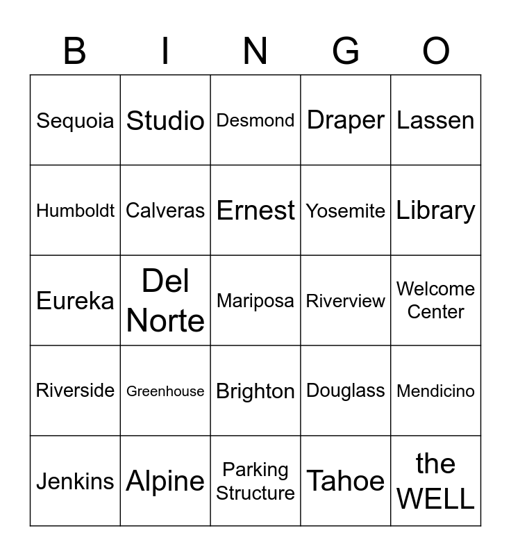 This bingo card has 35 words: Placer, Kadema, Sierra, Calveras, Brighton, Draper, Humboldt, AMC, Ernest, Sutter, Eureka, Lassen, Amador, Santa Clara, Sequoia, Riverview, Tahoe, Del Norte, Riverside, Mariposa, Douglass, Jenkins, Mendicino, Alpine, Desmond, Library, the WELL, University Union, Yosemite, Welcome Center, Hornet Stadium, Parking Structure, Greenhouse, Studio and Bencia.