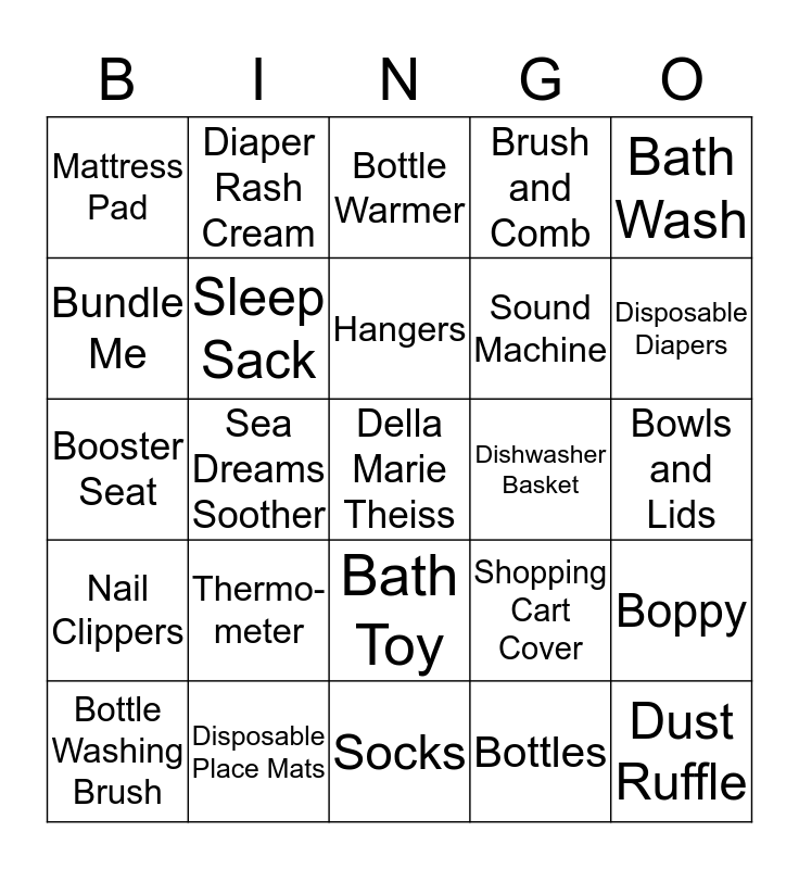 This bingo card has a free space and 24 words: Thermo-meter, Disposable Place Mats, Hangers, Bottle Washing Brush, Bath Wash, Mattress Pad, Bundle Me, Diaper Rash Cream, Dishwasher Basket, Bath Toy, Sound Machine, Booster Seat, Shopping Cart Cover, Boppy, Sleep Sack, Bottles, Bowls and Lids, Bottle Warmer, Disposable Diapers, Sea Dreams Soother, Dust Ruffle, Nail Clippers, Brush and Comb and Socks.