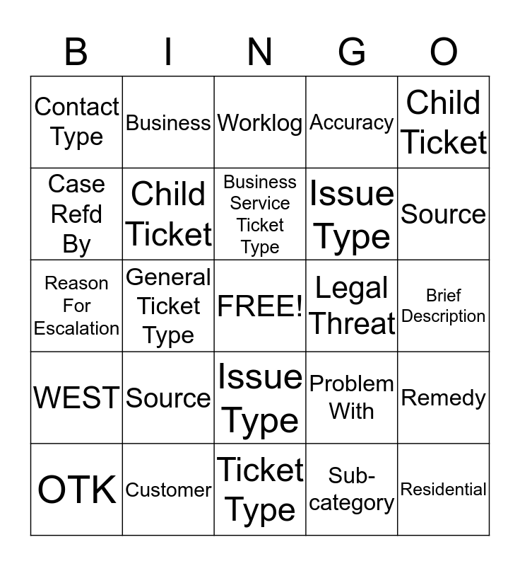 This bingo card has a free space and 24 words: Source, Customer, Business Service Ticket Type, OTK, Child Ticket, Contact Type, Case Refd By, Business, Legal Threat, Issue Type, Issue Type, Reason For Escalation, Problem With, Remedy, Child Ticket, Sub-category, Brief Description, Worklog, Source, General Ticket Type, Residential, WEST, Accuracy and Ticket Type.