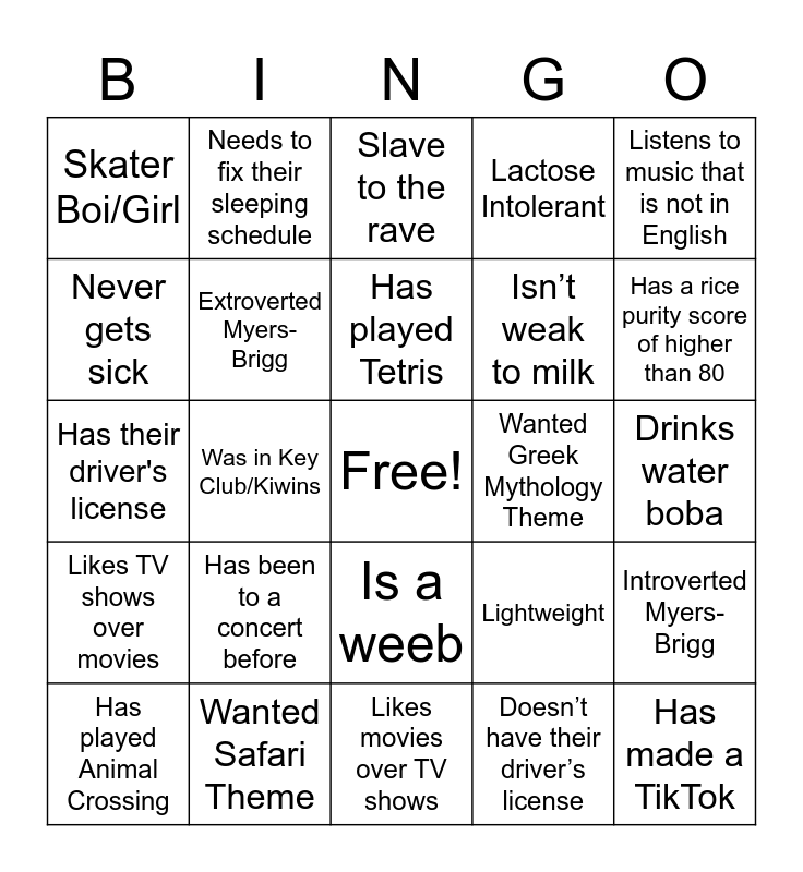 This bingo card has a free space and 25 words: Has been to a concert before, Likes movies over TV shows, Has played Tetris, Has played Animal Crossing, Listens to music that is not in English, Skater Boi/Girl, Never gets sick, Needs to fix their sleeping schedule, Wanted Greek Mythology Theme, Is a weeb, Isn’t weak to milk, Has their driver's license, Lightweight, Introverted Myers-Brigg, Extroverted Myers-Brigg, Listens to music that is only in English, Drinks water boba, Slave to the rave, Has a rice purity score of higher than 80, Was in Key Club/Kiwins, Has made a TikTok, Wanted Safari Theme, Likes TV shows over movies, Lactose Intolerant and Doesn’t have their driver’s license.