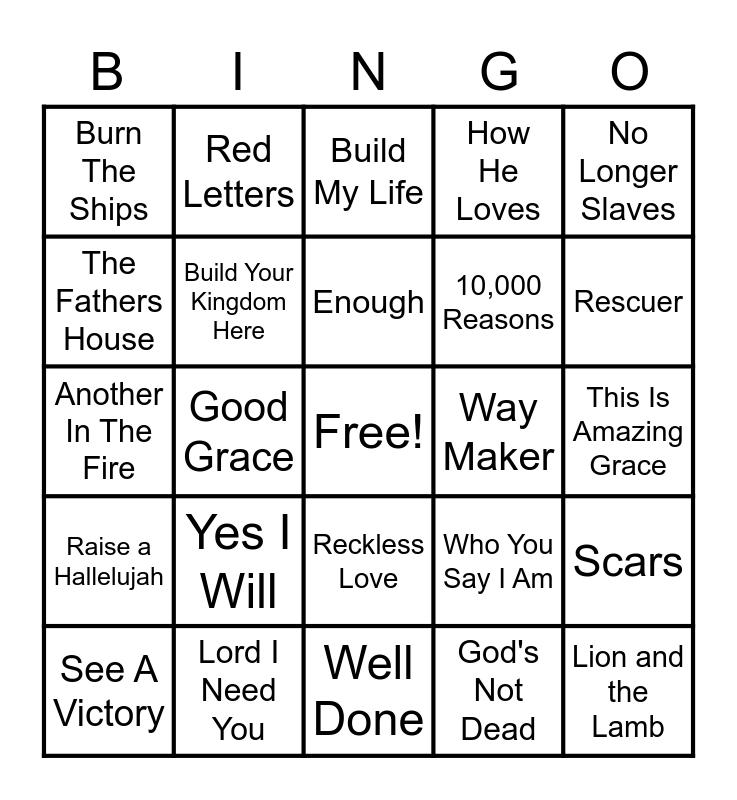 This bingo card has a free space and 32 words: God's Not Dead, Glorious Day, Good Grace, Surrounded (Fight My Battles), Raise a Hallelujah, Build Your Kingdom Here, No Longer Slaves, Scars, Red Letters, My Victory, Enough, Build My Life, This We Know, Do It Again, Way Maker, This Is a Move, See A Victory, Another In The Fire, Reckless Love, Yes I Will, Who You Say I Am, Living Hope, This Is Amazing Grace, Lord I Need You, Lion and the Lamb, How He Loves, 10,000 Reasons, The Fathers House, Burn The Ships, Well Done, My Lighthouse and Rescuer.