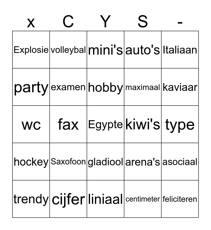 This bingo card has a free space and 24 words: Saxofoon, cijfer, hobby, trendy, Italiaan, Explosie, party, volleybal, kiwi's, gladiool, maximaal, wc, arena's, asociaal, examen, centimeter, type, mini's, kaviaar, fax, feliciteren, hockey, auto's and liniaal.