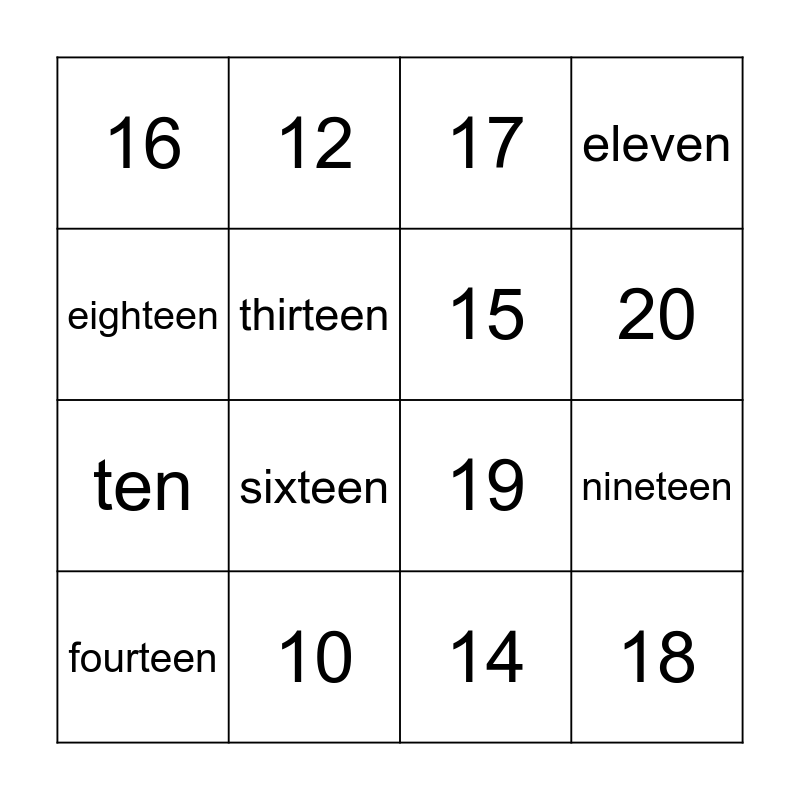 This bingo card has 21 words: 10, 11, 12, 13, 14, 15, 16, 17, 19, 20, ten, eleven, 18, twelve, thirteen, fifteen, fourteen, sixteen, eighteen, nineteen and twenty.
