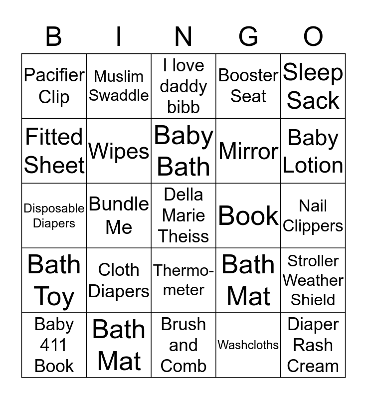 This bingo card has a free space and 24 words: Cloth Diapers, Bath Mat, Baby Bath, Baby 411 Book, Sleep Sack, Pacifier Clip, Fitted Sheet, Muslim Swaddle, Book, Thermo-meter, Mirror, Disposable Diapers, Bath Mat, Stroller Weather Shield, Wipes, Washcloths, Nail Clippers, I love daddy bibb, Baby Lotion, Bundle Me, Diaper Rash Cream, Bath Toy, Booster Seat and Brush and Comb.