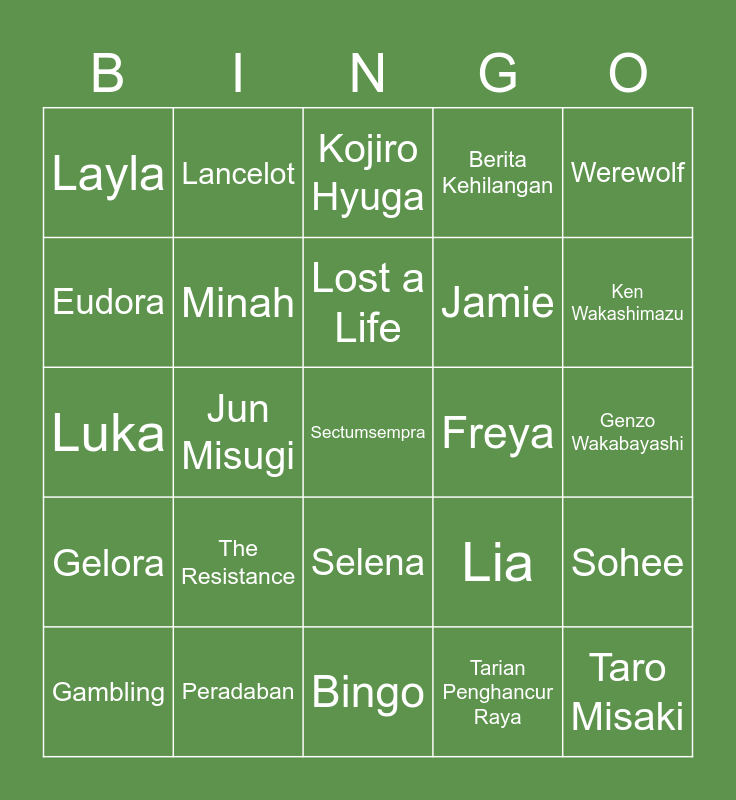 This bingo card has 25 words: The Resistance, Bingo, Lost a Life, Gambling, Werewolf, Layla, Eudora, Lancelot, Freya, Selena, Jamie, Luka, Lia, Sohee, Minah, Taro Misaki, Genzo Wakabayashi, Kojiro Hyuga, Ken Wakashimazu, Jun Misugi, Sectumsempra, Peradaban, Gelora, Berita Kehilangan and Tarian Penghancur Raya.