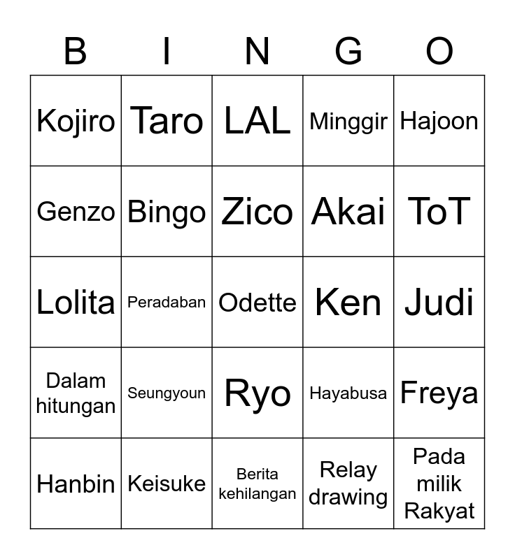 This bingo card has a free space and 24 words: Seungyoun, Keisuke, Zico, Hanbin, Hajoon, Kojiro, Genzo, Taro, Ken, Ryo, Akai, Lolita, Hayabusa, Freya, Bingo, Relay drawing, Judi, LAL, ToT, Peradaban, Pada milik Rakyat, Dalam hitungan, Minggir and Berita kehilangan.